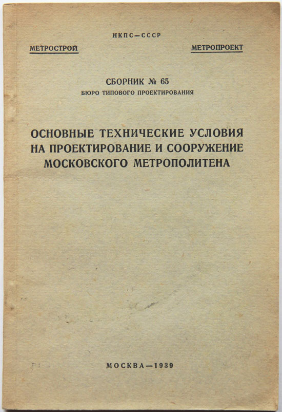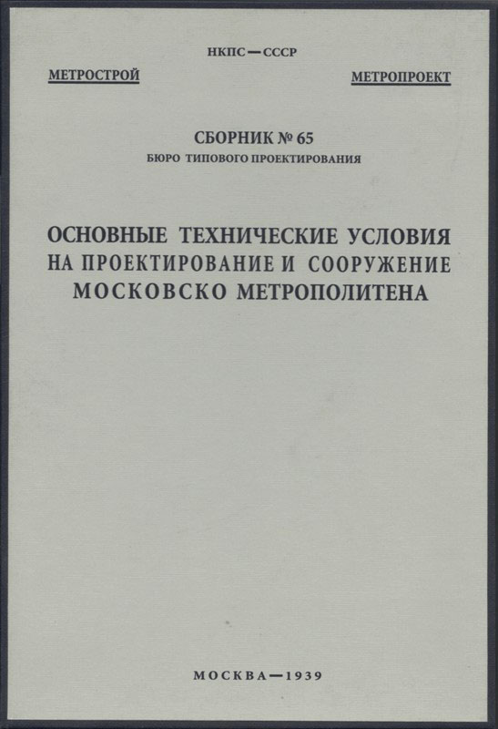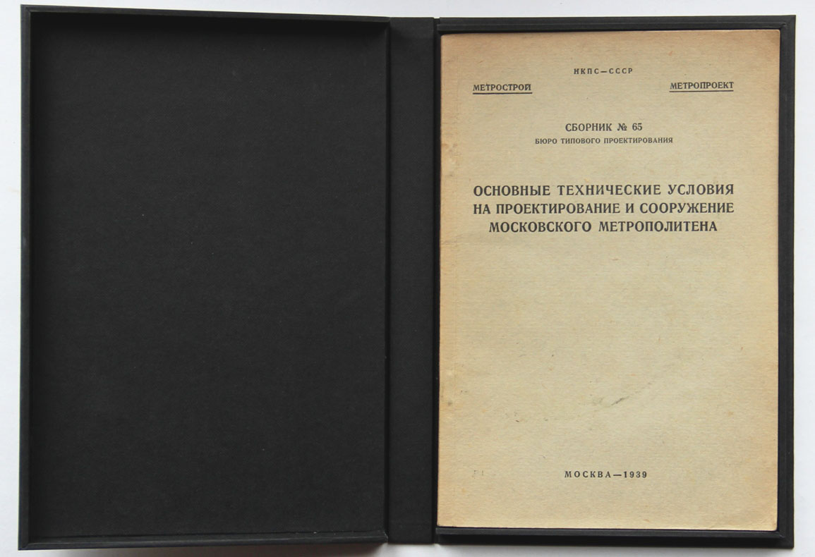 Основные технические условия на проектирование и сооружение Московского метрополитена: Руководство для проектирования и производства работ в пределах системы Метростроя. / Бюро типового проектирования, сборник № 65. М., 1939. 108 с. 22,5 х 15 см. В издательской обложке и в современном художественном футляре. Отличная сохранность.