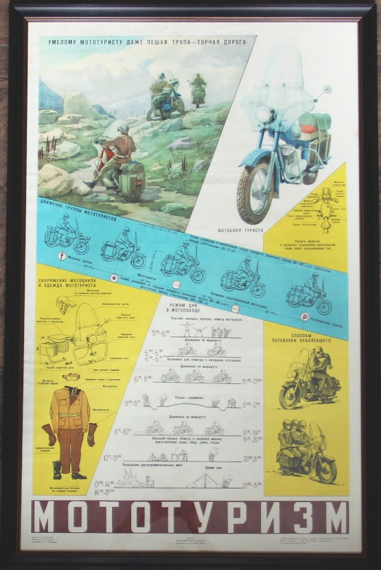 Настоящий плакат был отпечатан в издательстве «Недра» в 1965 г. по заказу Центрального Совета по туризму ВЦСПС под девизом «Умелому мототуристу даже пешая тропа - торная дорога». Тематически плакат разделен на несколько секторов, в которых представлены: схема устройства мотоцикла; схема движения группы мототуристов в незнакомом городе и за городом; снаряжение мотоцикла и одежда мототуриста; режим дня в мотопоходе; способы перевозки заболевшего. Автором текста плаката был П.П.Разживин, художник - Э.П.Путинцев.