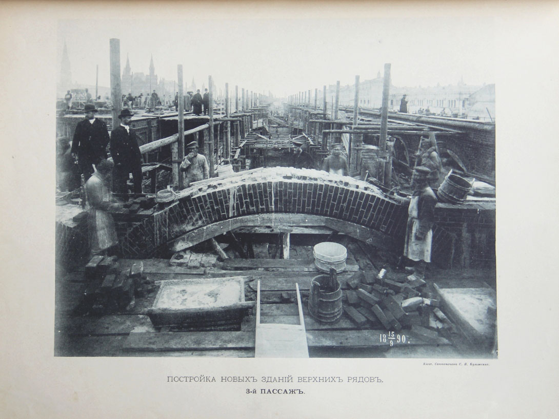 Летом 1889 г. началась подготовка к строительству. 21 мая 1890 г. состоялась закладка здания. На официальной церемонии присутствовали представители высшей московской администрации и городского самоуправления. В 1890-1891 г.г. были возведены фундамент и стены Верхних торговых рядов, а в 1893 г. завершены его облицовка и внутренняя отделка. Огромные Верхние торговые ряды с их двумя зданиями и целой подземной улицей под домом, с центральным отоплением и собственной электростанцией построили за два с половиной года.