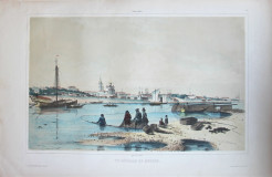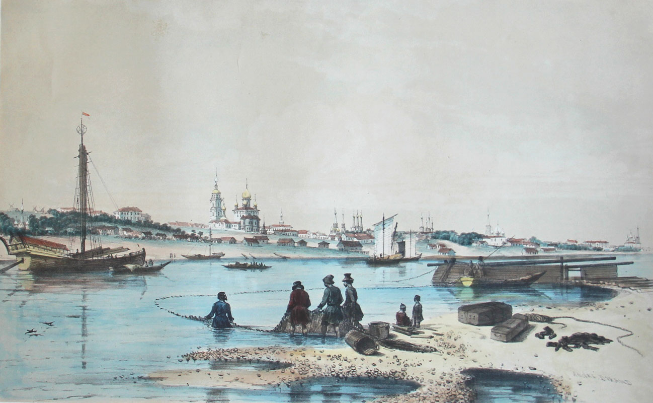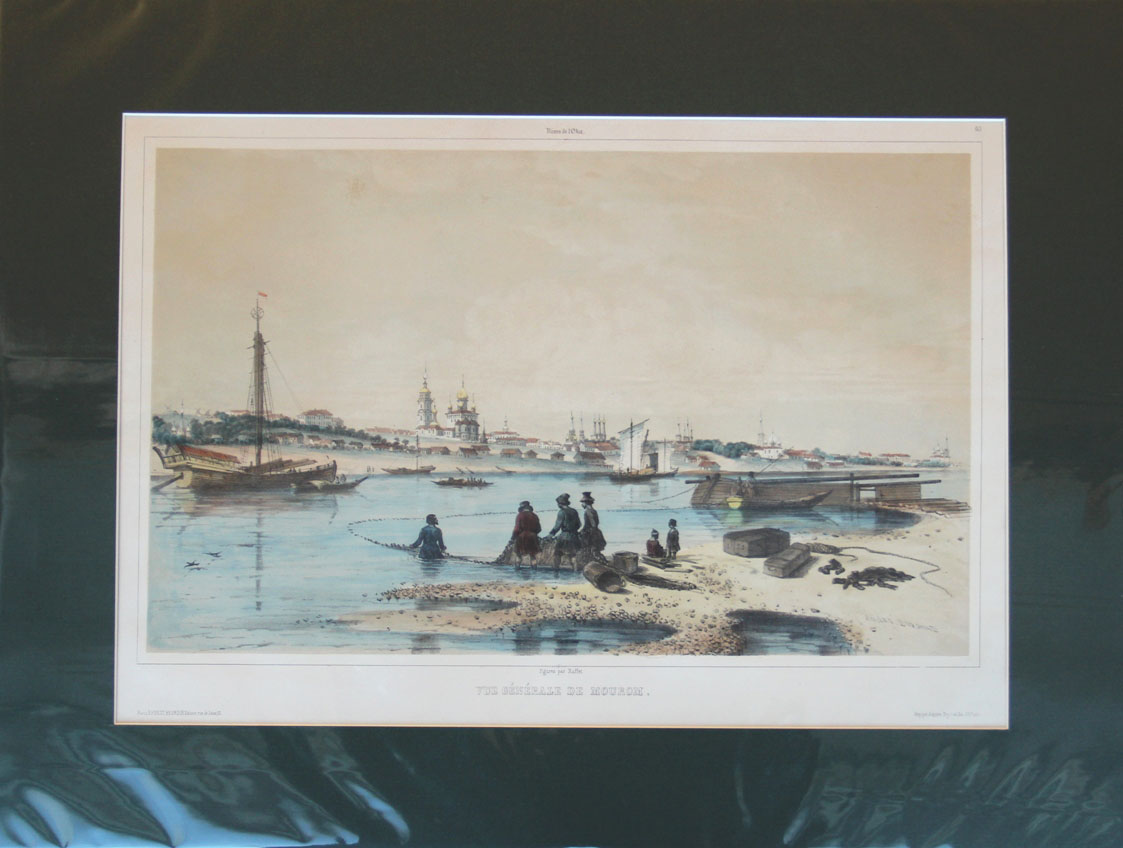 Rives de l'Oka: Vue generale de Mourom. André Durand. Figures par Raffet. Ernest Bourdin, édituer. Paris, Imprimé par Auguste Bry, 1840-s. - Берега Оки: Общий вид Мурома. По рисунку Андре Дюрана. Фигуры резал Раффе. Издатель Эрнест Бурден. Париж, отпечатано Огюстом Бри, 1840-е г.г. В правой нижней части изображения литографирована подпись художника: «André Durand». Тоновая литография в паспарту. Издательская раскраска акварелью. Размеры оттиска: 26,5 х 42,7 см. Размеры в паспарту: 45 х 59,5 см. Отличная сохранность.