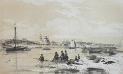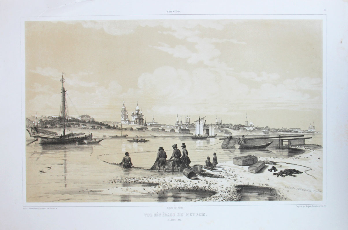 Rives de l'Oka: Vue generale de Mourom. (31 Aoút 1839). André Durand. Figures par Raffet. Gihaut frères, édituers. Paris, Imprimé par Auguste Bry, 1840-s. - Берега Оки: Общий вид Мурома. По рисунку Андре Дюрана. Фигуры резал Раффе. Издатели братья Жио. Париж, отпечатано Огюстом Бри, 1840-е г.г. В правой нижней части изображения литографирована подпись художника: «André Durand, 1846». Тоновая литография в паспарту. Размеры оттиска: 26 х 43 см. Размеры в паспарту: 45 х 59,5 см. Отличная сохранность.