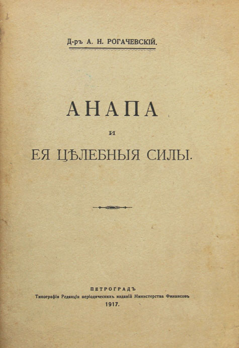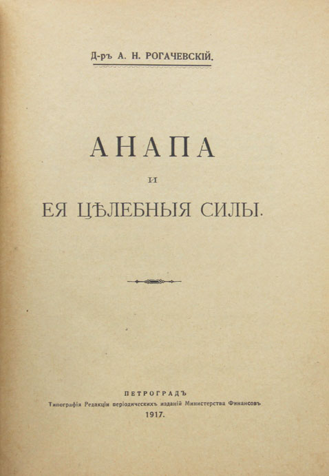 В этой работе автор дает краткий историко-географический очерк Анапы, рассказывает об условиях жизни в ней. Представлены рекомендации, касающихся приема морских, воздушных, песочных, солнечных и грязевых ванн, лечения виноградным соком, кефиром, медом. Перечисляя показания к лечению больных в Анапе, А.Н.Рогачевский особенно выделяет туберкулез костей, суставов и желез, приводит статистические данные о распространении его в России и о высокой смертности от него, в то же время отмечая, что в Анапе это заболевание прекрасно лечится.