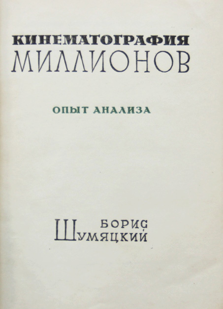 Шумяцкий Б. Кинематография миллионов: Опыт анализа. [М.: Кинофотоиздат, 1935]. 378, [2] с.; 15 л. илл. 17 х 12,5 см. Тираж 7000 экз. В издательском переплете и в современном цельнотканевом футляре. Отличная сохранность.