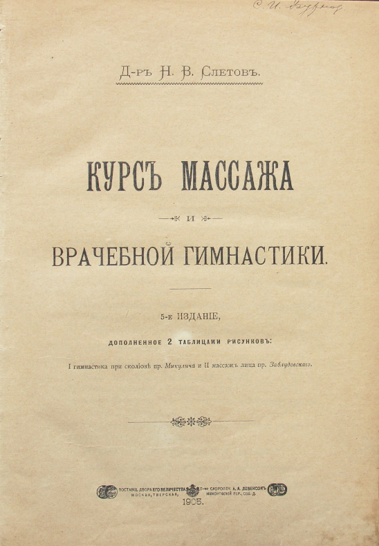 Слетов Н.В., д-р. Курс массажа и гимнастики. 5-е издание, дополненное 2 таблицами рисунков: I гимнастика при сколиозе пр. Микулича и II массаж лица пр. Заблудовскаго. М., т-во скоропеч. А.А.Левенсон, 1905. [2], 172 с.; 9 л. табл. 24 х 16,7 см. Одно из первых русских руководств по массажу и мануальной терапии. В полукожаном переплете эпохи. Хорошая сохранность. На переднем форзаце и нескольких страницах владельческий штамп: «Врач С.И.Бурназ» и его подпись на титульном листе.