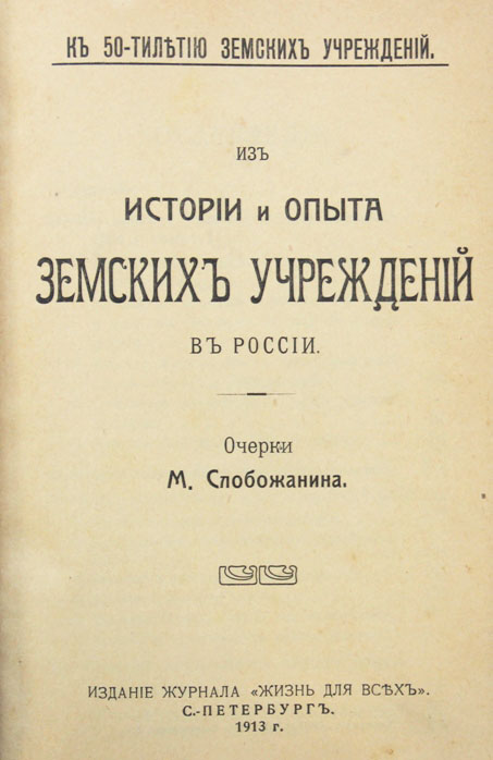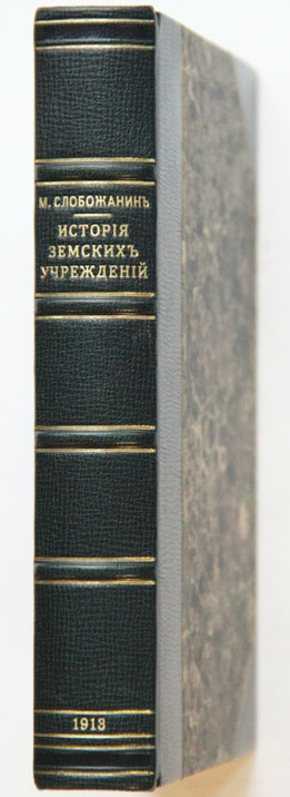 Слобожанин М. Из истории и опыта земских учреждений в России. Спб., издание журнала «Жизнь для всех», 1913. XII, 551 c. 18 х 12 см. Книга впоследствии не переиздавалась. В современном полукожаном переплете. Сохранена издательская обложка. Очень хорошая сохранность. На некоторых страницах дореволюционный владельческий штамп-экслибрис.