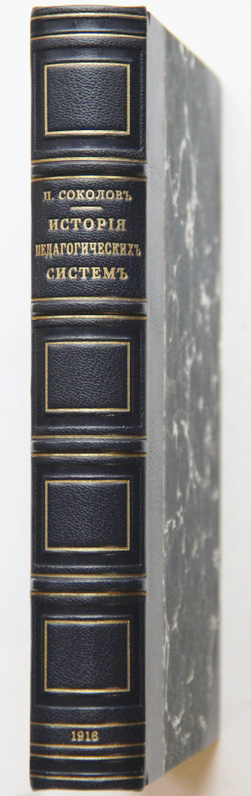 Соколов П. История педагогических систем. Издание второе исправленное и дополненное. Пг., издание В.С.Клестова, 1916. [2], II, 708 с., с илл. 22,7 х 14,8 см. В современном полукожаном переплете. Отличная сохранность. На титульном листе и некоторых страницах дореволюционный штамп Фундаментальной библиотеки Никольск-Уссурийского реального училища.