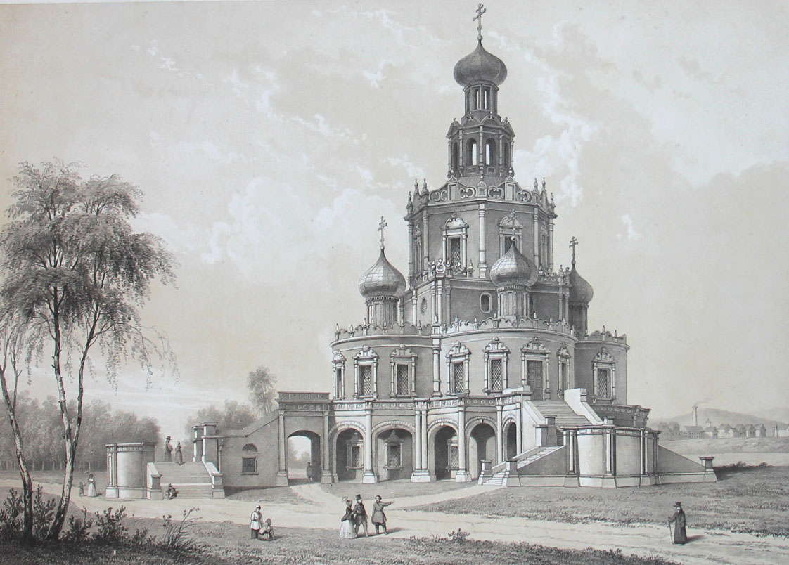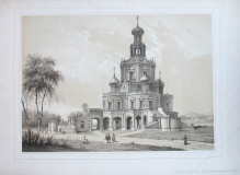 Церковь Покрова Пресвятой Богородицы в Филях. Б.м., середина XIX века. Тоновая литография в паспарту. Размер изображения: 26 х 36,8 см. Размер в паспарту: 45 х 55,7 см. Очень хорошая сохранность.