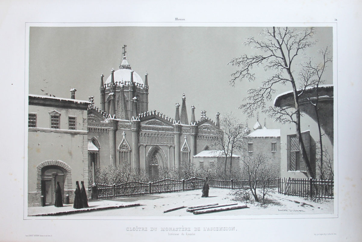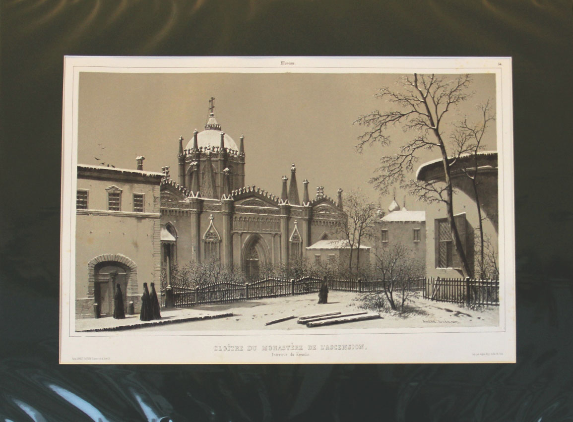 Cloitre du monastere de L’Ascension, interieur du Kremlin. Intérieur du Kremlin. André Durand. Ernest Bourdin, editeur. Paris, Imprimé par Auguste Bry, 1840-s. - Церковь Вознесенского монастыря в Кремле. Художник Андре Дюран. Издатель Эрнест Бурден. Париж, отпечатано Огюстом Бри, 1840-е г.г. Тоновая литография в паспарту. В правой нижней части изображения литографирована подпись художника: «André Durand». Размер оттиска: 26 х 43 см. Размер в паспарту: 45 х 59,5 см. Отличная сохранность.