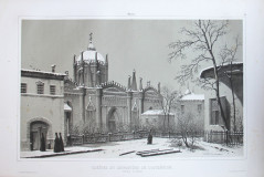 Лист 54 из серии видов России. Вверху листа подзаголовок «Moscou» (Москва). Лист из альбома «Excursion pittoresque et archeologique en Russie» («Живописное путешествие по России»), который был издан известными французскими литографами братьями Жио, работавшими в 1820-е - 1860-е г.г. Лист был награвирован Андре Дюраном на камне по собственному рисунку. Его подпись находится в правой нижней части литографии. Серия издавалась четырьмя выпусками с 1842 по 1849 г.г. В общей сложности А.Дюраном было исполнено для этого альбома 100 литографий.