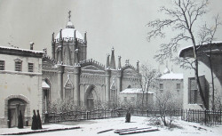 Церковь св. великомученицы Екатерины была заложена в 1808 г. на месте обветшавшего и разобранного храма св. Георгия и представляла собой грандиозное сооружение, по размерам не уступающее соборному храму. Церковь была выполнена по проекту Карла Росси в неоготическом стиле. Сложный силуэт с многочисленными башенками и изящный декор стен придавали зданию легкость и нарядность. Строительство церкви было прервано войной 1812 г. Во время пребывания в Москве французы устроили в ней хлебопекарню. Церковь была закончена лишь в 1817 г. Она стала одним из лучших неоготических памятников Москвы и единственным работы К.Росси.
