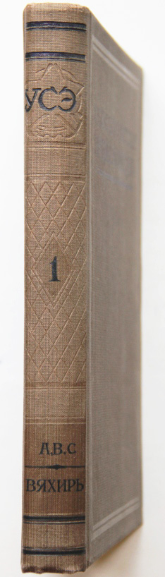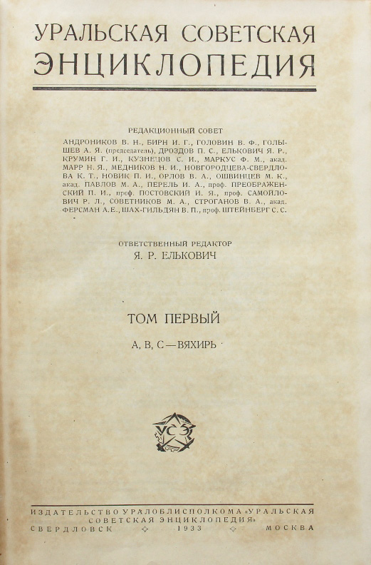 Уральская советская энциклопедия. Ответственный редактор Я.Р.Елькович. Том первый [единственный]: А, В, С - Вяхирь. Свердловск - М.: издательство Уралоблисполкома «Уральская советская энциклопедия, 1933. 854 стлб.; с илл. в тексте и 19 илл. на отдельных листах. 25,8 х 17,5 см. В издательском переплете. Отличная сохранность.