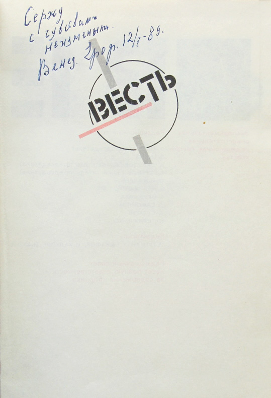 Весть: Проза. - Поэзия. - Драматургия. М.: Книжная палата, 1989. 510, [2] с. 20,3 х 14 см. В издательском переплете и в современном художественном футляре. Хорошая сохранность. Первая полная публикация повести В.Ерофеева «Москва-Петушки». На с. 1 автограф В.Ерофеева: «Сержу с чувством неизменным. Венед. Ероф. 12/7-89».