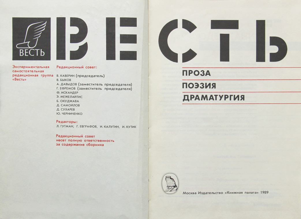 По замыслу составителей, настоящий литературный сборник должен был стать первым безгонорарным изданием кооперативного издательства «Весть» и заложить финансовую основу будущего издательства, главные задачи которого должны были заключаться в поиске новых литературных имен и публикации произведений, без достаточных оснований отвергаемых существовавшими издательствами. Эти задачи и предопределили состав сборника. Наряду с участниками инициативной группы и несколькими известными писателями (В.Каверин, В.Быков, Ф.Искандер, Б.Окуджава, Д.Самойлов и др.), безвозмездно предоставившими свои рукописи для сборника, в него были включены произведения авторов, оригинальные сочинения которых к тому моменту почти или совсем не публиковались. По ряду причин кооперативное издательство не было учреждено, однако была сформирована экспериментальная самостоятельная редакционная группа «Весть», деятельность которой началась изданием этого, уже сложившегося сборника.