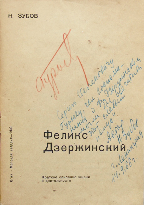 Зубов Н. Феликс Дзержинский: Краткое описание жизни и деятельности. [М.]: ОГИЗ - Молодая гвардия, 1933. 80 с. 17,7 х 12,3 см. Первое издание. В издательской обложке и в современном художественном футляре. Очень хорошая сохранность. На титульном листе дарственная надпись: «Сергею Степановичу Гурьеву, чьи воспоминания о Ф.Дзержинском могли бы обогатить этот слабый «опус». Автор Н.Зубов г. Ленинград 14.9.66 г.». Экземпляр из библиотеки С.С.Гурьева с его автографами на передней обложке и титульном листе, а также пометами в тексте.