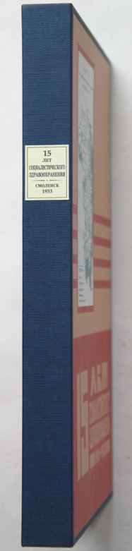 15 лет социалистического здравоохранения. 1918-1933. Смоленск: Западное областное Государственное издательство, 1933. 212 с., с илл. 24,7 х 16,5 см. Тираж 1282 экз. В издательской обложке и в современном художественном футляре. На титульном листе владельческий штамп: «Врач Сигизмунд Амвросиевич Маркевич». На передней обложке штамп: «Областной Дом санитарной культуры. г. Смоленск, Б.Пролетарская, 7. Просьба подтвердить получение». Хорошая сохранность. Редкость.