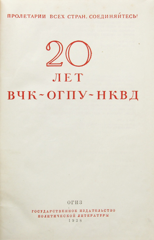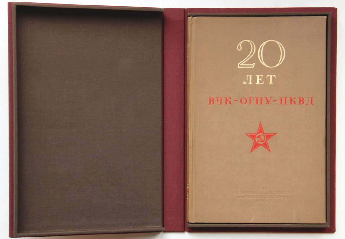 20 лет ВЧК-ОГПУ-НКВД. [М.]: ОГИЗ - Государственное издательство политической литературы, 1938. 64 с.; 5 л. илл. 22,5 х 14,8 см. Юбилейное издание, посвященное 20-й годовщине ВЧК-ОГПУ-НКВД. Художественный редактор С.Телингатер. Экземпляр из особой части тиража, предназначавшейся для высших чинов НКВД и правительства. В издательском переплете и в современном цельнотканевом художественном футляре с золотым тиснением на передней крышке. Очень хорошая сохранность. Редкость. Нет 2 л. илл. с портретами Н.И.Ежова, аккуратные владельческие пометы в тексте простым карандашом.