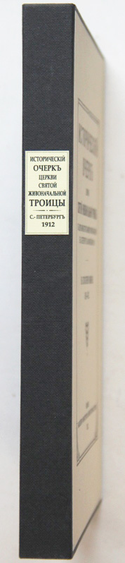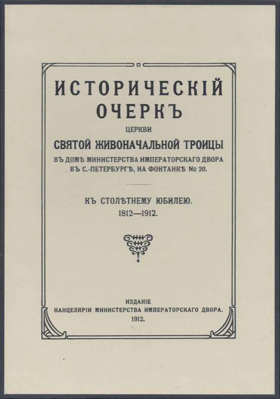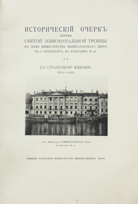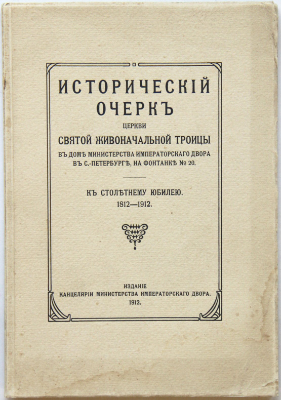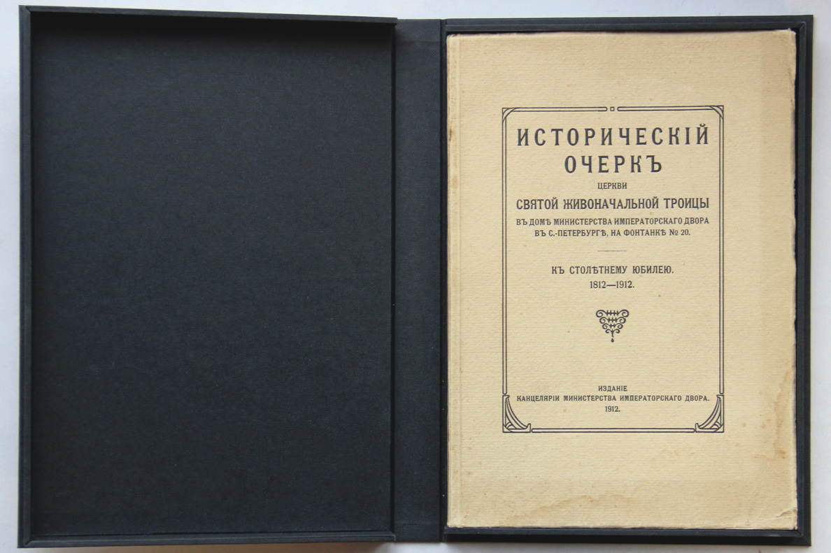 Исторический очерк церкви Святой Живоначальной Троицы в доме Министерства Императорского Двора в С.-Петербурге, на Фонтанке № 20. К столетнему юбилею. 1812-1912. [Спб.], издание Канцелярии Министерства Императорского Двора, [1912]. 40, [2] с.; 13 л. илл. 23 х 15,7 см. В издательской обложке и в современном художественном футляре. Очень хорошая сохранность.