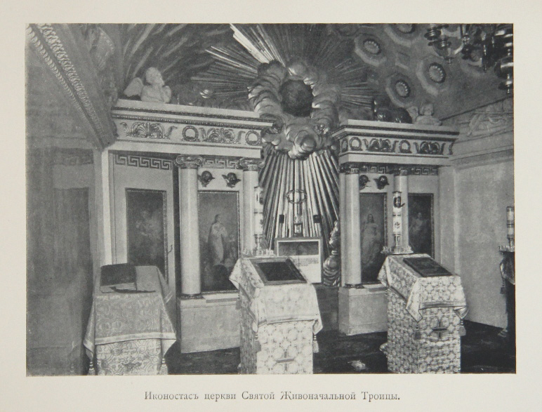 Церковь Св. Живоначальной Троицы была построена в 1812 г. по распоряжению крупного государственного деятеля князя Александра Николаевича Голицына (1773-1844), обер-прокурора Святейшего Синода, управляющего иностранными вероисповеданиями и министра народного просвещения. Для того времени было характерно активное проникновение в Россию масонства и мистицизма, и А.Н.Голицын был одним из ярких представителей этого духовного направления. Он был президентом знаменитого Библейского общества и ряда филантропических организаций. Вновь построенная церковь несла на себе отпечаток мистических настроений ее создателя, это проявилось во внешнем виде и внутреннем декоре храма, далеко уходящем от бытовавшей в то время православной традиции. Интересен и другой факт: А.Н.Голицын начал строительство храма после взятия Москвы Наполеоном, когда в столице нарастала паника, многие даже думали о бегстве из города, на который вот-вот двинется войско грозного завоевателя. Таким поступком А.Н.Голицына был удивлен и царь, но князь сумел доказать ему свою правоту. Церковь стала чрезвычайно необычным памятником времени и архитектуры, росписи в ней создавали лучшие мастера эпохи.