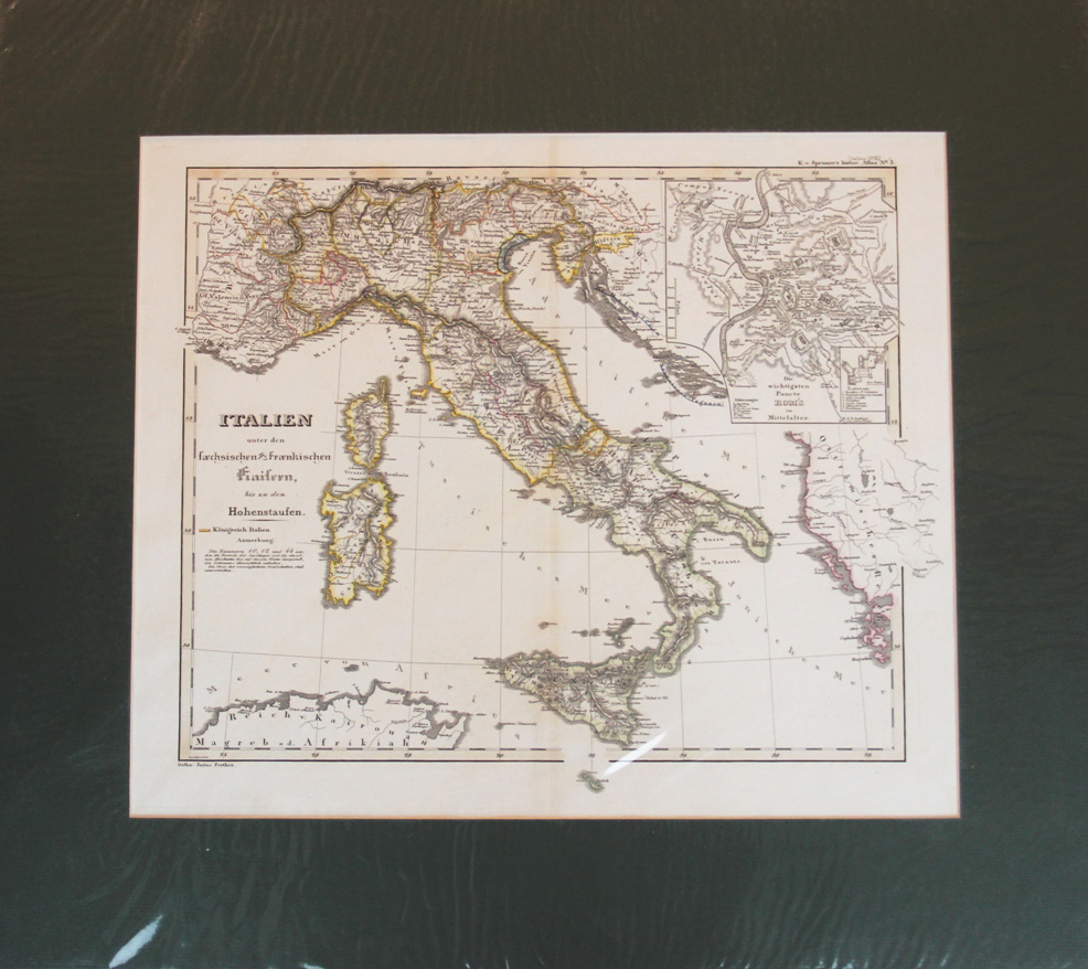 Italien unter den Saechsischen & Fraenkischen Kaisern, bis zu den Hohhenstaufen. K.v.Spruner’s histor. Atlas. № 5. Italien № II. Goth? [Gotha]: Justus Perthes, [1854-1855]. - Италия под властью саксонских и франкских монархов до восшествия на престол династии Гогенштауфенов. Лист из Атласа истории и древностей Шпрюнера. № 5. Италия, № II. [Гота]: Юстус Пертес, [1854-1855]. Гравюра на стали в паспарту. Размеры оттиска: 33,5 х 40 см. Размеры в паспарту: 52 х 59,1 см. Издательская подкраска границ акварелью. Отличная сохранность.
