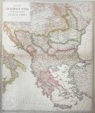 Карта Европейской Турции, Румынии, Сербии, Черногории, Королевства Эллинов и Болгарии. Масштаб 1 : 2520000; 180 верст в 1 дюйме. Спб., Картографическое заведение А.Ильина, [1884]. Хромолитография в паспарту. Размер оттиска: 66,6 х 56,5 см. Размер листа: 82,5 х 72,2 см. Отличная сохранность.