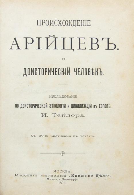 Тейлор И. Происхождение арийцев и доисторический человек: Изследование по доисторической этнологии и цивилизации в Европе. С 30-ю рисунками в тексте. М., издание магазина «Книжное дело», 1897. IV, 332 с., с илл. 17,8 x 12,2 см. В полукожаном переплете эпохи. Отличная сохранность.