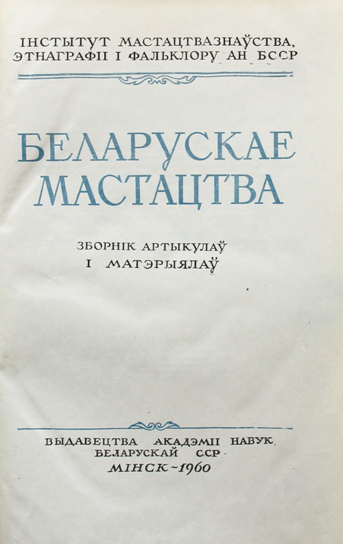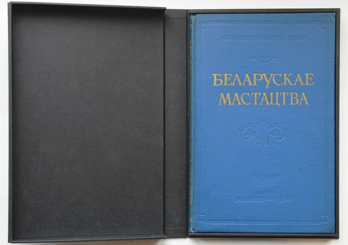 Белорусское искусство: Сборник статей и материалов. [Вып. II]. Минск: издательство Академии наук Белорусской ССР, 1960. 218, [2] с., с илл. 26 х 17 см. Тираж 2000 экз. На белорусском языке. В издательском переплете и в современном художественном футляре. Очень хорошая сохранность. Ошибка типографии: с. 193-208 вставлены дважды. На переднем форзаце дарственная надпись: «Многоуважаемому Юрию Арсентьевичу с выражением сердечной благодарности за творческую помощь белорусским театроведам в изучении истории театра от сектора истории театра, кино и музыки института искусствоведения, этнографии и фольклора АН БССР. [Подписи]».