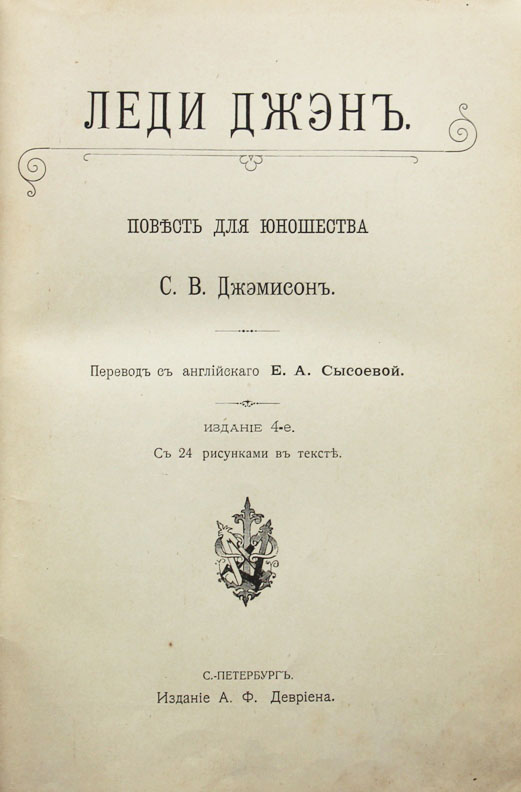 Джэмисон С.В. Леди Джэн: Повесть для юношества. Перевод с английскаго Е.А.Сысоевой. Издание 4-е. С 24 рисунками в тексте. Спб., издание А.Ф.Девриена, 1910-е г.г. [6], 257 с., с илл. 22,2 х 15 см. В иллюстрированном издательском переплете. Удовлетворительная сохранность.
