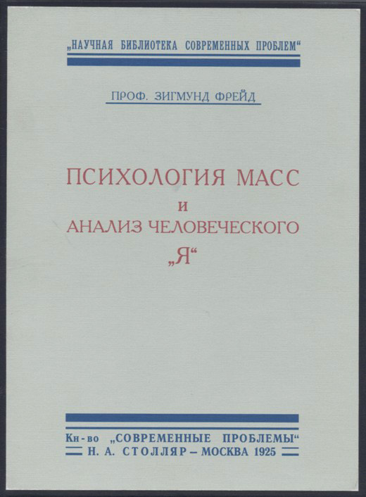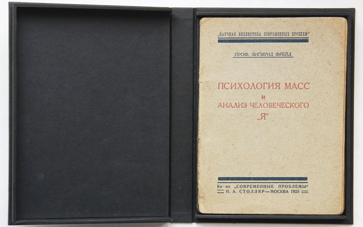 Фрейд З., проф. Психология масс и анализ человеческого «Я». Перевод с немецкого д-ра Я.М.Когана. М.: Современные проблемы, 1925. 98, [2] с. 17,5 х 13 см. Тираж 3000 экз. В издательской обложке и в современном художественном футляре. Хорошая сохранность.