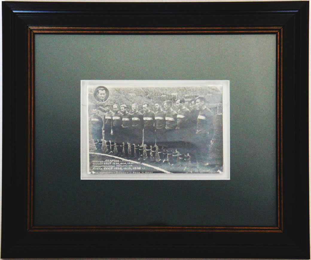 Футбольная команда «Спартак» (Москва): Групповой снимок. [М.], изд. спорткомбината «Динамо», б.г. Тиражное рекламное фото. В современном паспарту и раме. Размер снимка: 9 х 13,7 см. Размер в раме: 26,2 х 31,5 см. Отличная сохранность.