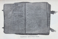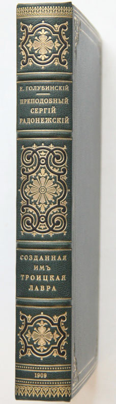 Голубинский Е. Преподобный Сергий Радонежский и созданная им Троицкая Лавра: Жизнеописание преподобнаго Сергия и путеводитель по Лавре. Издание второе, исправленное и дополненное, напечатанное Императорским Обществом Истории и Древностей Российских при Московском Университете. С 36 снимками в тексте и с приложением 20 таблиц на конце книги. М., Синодальная типография, 1909. VI, 424 с., с илл.; 20 л. табл. 26 x 17 см. В современном цельнокожаном переплете с золотым тиснением на корешке и крышках, муаровые форзацы. Сохранена издательская обложка. Отличная сохранность. Страницы 97-108 пронумерованы дважды, далее продолжается правильная пагинация.