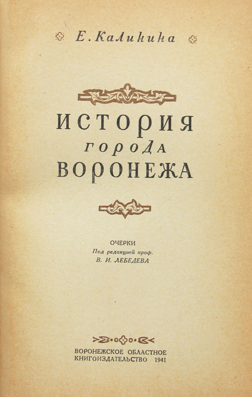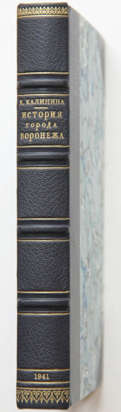 Калинина Е. История города Воронежа: Очерки. Под редакцией проф. В.И.Лебедева. Воронеж: Воронежское областное книгоиздательство, 1941. 324, [2] с., с илл. 21,5 х 14 см. Тираж 5000 экз. Первая научно-популярная книга, рассказывающая об истории Воронежа, впоследствии не переиздавалась. В современном полукожаном переплете. Отличная сохранность.