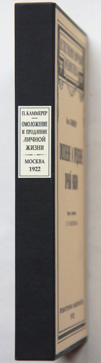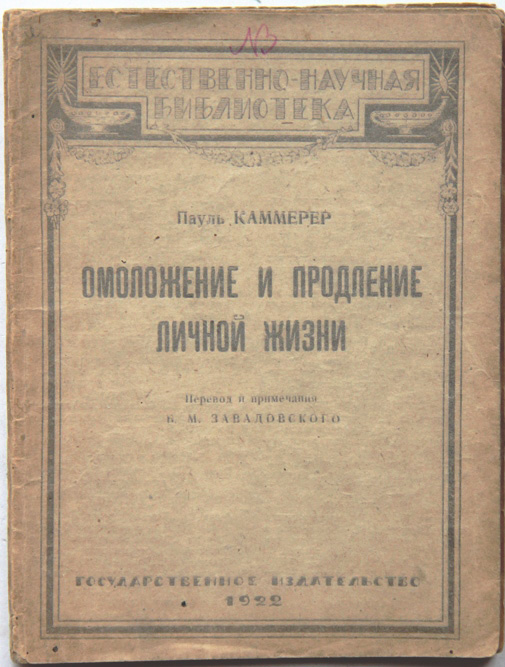 Каммерер П. Об омоложении и продлении личной жизни: Опыты на растениях, животных и человеке в общедоступном изложении. Перевод Б.М.Завадовского. [М.]: Государственное издательство, 1922. 86, [2] с., с илл. 17,2 х 13 см. В издательской обложке и в современном художественном футляре. Хорошая сохранность.