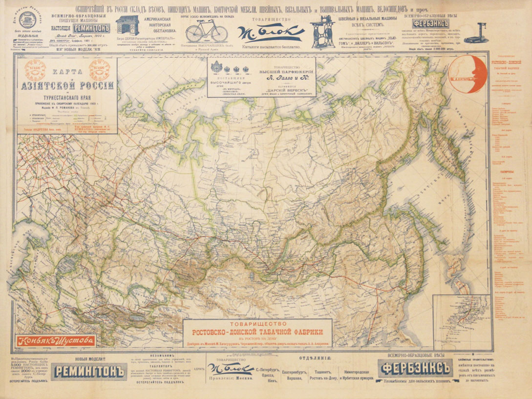 Карта Азиатской России и Туркестанскаго края. Приложение к Сибирскому календарю 1903 г. Издание Ф.П.Романова в Томске. Масштаб: в Английском дюйме 250 верст или 1:10500000. Спб., Картографическое заведение А.Ильина, [1902]. В раме. Размер карты: 46,5 х 73,5 см. Размер в раме: 72,5 х 92 см. Очень хорошая сохранность. На полях и оборотной стороне карты - многочисленная реклама торговых и промышленных предприятий России.