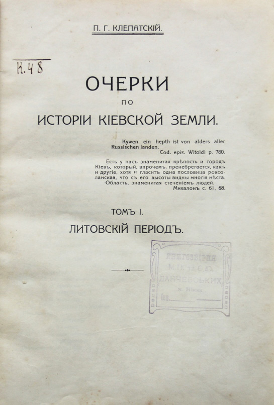 Клепатский П.Г. Очерки по истории Киевской земли. Том I [единственный]: Литовский период. / Записки Историко-филологического факультета Императорского Новороссийского университета, Вып. 5. [Одесса, 1912]. XLIII, 599 c.; 9 л. карт. 23 х 15,8 см. В современном полукожаном переплете. Отличная сохранность. На титульном листе и некоторых страницах владельческий штамп на украинском языке библиотеки М.П. и Е.Ю. Данчевских в г. Нежине.