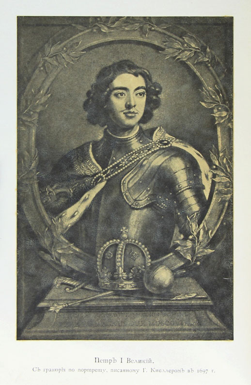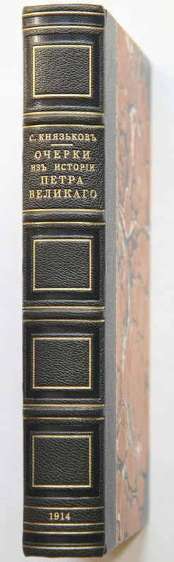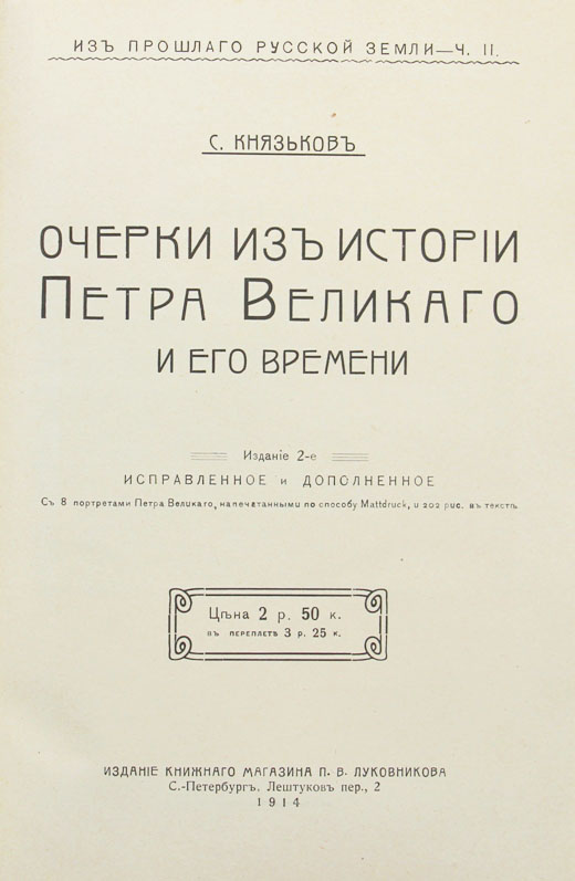 Князьков С. Очерки из истории Петра Великаго и его времени. Издание 2-е исправленное и дополненное. С 8 портретами Петра Великаго, напечатанными по способу Mattdruck, и 202 рис. в тексте. / Из прошлаго русской земли, Ч. II. Спб., издание книжнаго магазина П.В.Луковникова, 1914. [4], 648, [2] с.; c илл. в тексте и 8 илл. на отдельных листах. 22,5 x 15 см. В современном полукожаном переплете. Отличная сохранность. Ч. I серии «Из прошлаго русской земли» - «Очерки из истории Допетровской Руси» в издании П.В.Луковникова вышла только через три года, в 1917 г.