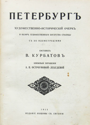 Курбатов В. Петербург: Художественно-исторический очерк и обзор художественнаго богатства столицы. С 315 иллюстрациями. Книжныя украшения А.П.Остроумовой-Лебедевой. [Спб.], издание Общины св. Евгении, 1913. VIII, 658, [6], 32 с.; с илл. в тексте и 2 илл. на отдельных листах. 14,3 х 10,5 см. В современном цельнокожаном переплете, повторяющем издательский, с золотым тиснением на корешке и крышках по рис. А.П.Остроумовой-Лебедевой. Отличная сохранность.