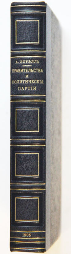 Лоуэлль А.Л. Правительства и политическия партии в государствах Западной Европы. (Франция, Италия, Германия, Австро-Венгрия, Швейцария). Перев. с англ. О.Полторацкой; редакц. Ф.Смирнова. [М.], издание С.Скирмунта, [1905]. VII, 644 с. 23 х 15,8 см. Сочинение впоследствии не переиздавалось. В современном полукожаном переплете. Отличная сохранность. На титульном листе владельческая подпись.