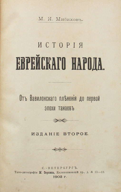 Мибихов М.Я. История еврейскаго народа: От Вавилонскаго пленения до первой эпохи танаев. Издание второе. Спб., типо-литография М.Зархина, 1902. [4], 222 с. 23,7 х 15,2 см. В издательском переплете с золотым тиснением на передней крышке. Очень хорошая сохранность. На переднем форзаце владельческая подпись, аккуратные читательские пометы в тексте простым карандашом.
