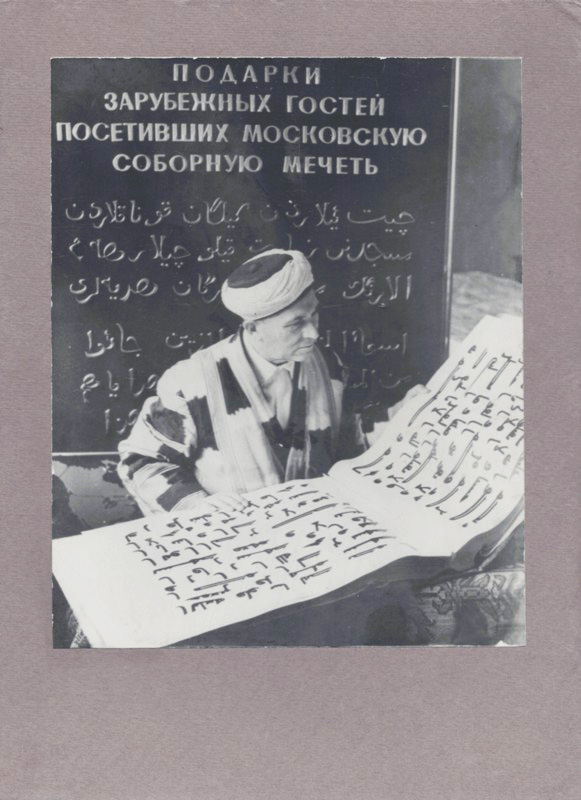 Наставник московских мусульман имам-хатыб Московской Соборной мечети Ахметзян Мустафин за чтением Корана Османа. [М.], 1960-е г.г. Оригинальная фотография в современном паспарту и раме. Размер снимка: 20 х 16 см. Размер в раме: 38 х 34 см. Отличная сохранность.