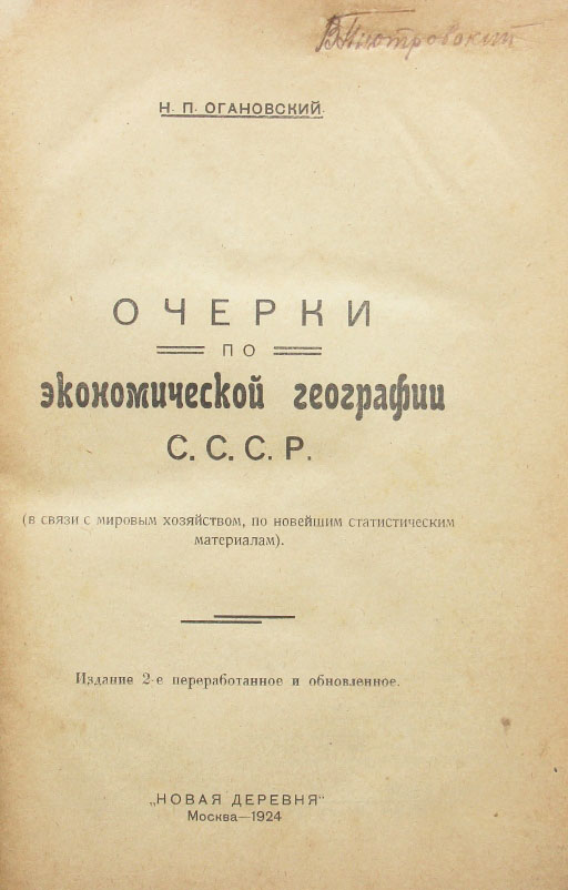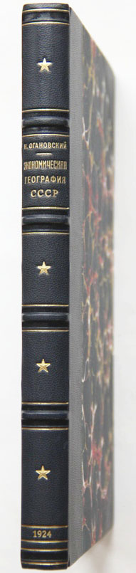 Огановский Н.П. Очерки по экономической географии С.С.С.Р. (в связи с мировым хозяйством, по новейшим статистическим материалам). Издание 2-е переработанное и обновленное. М.: Новая деревня, 1924. [2], VIII, 3-319, II с., с илл. 25,7 х 17 см. В современном полукожаном переплете с золотым тиснением на корешке. Сохранена издательская обложка. Очень хорошая сохранность. На титульном листе владельческая подпись.