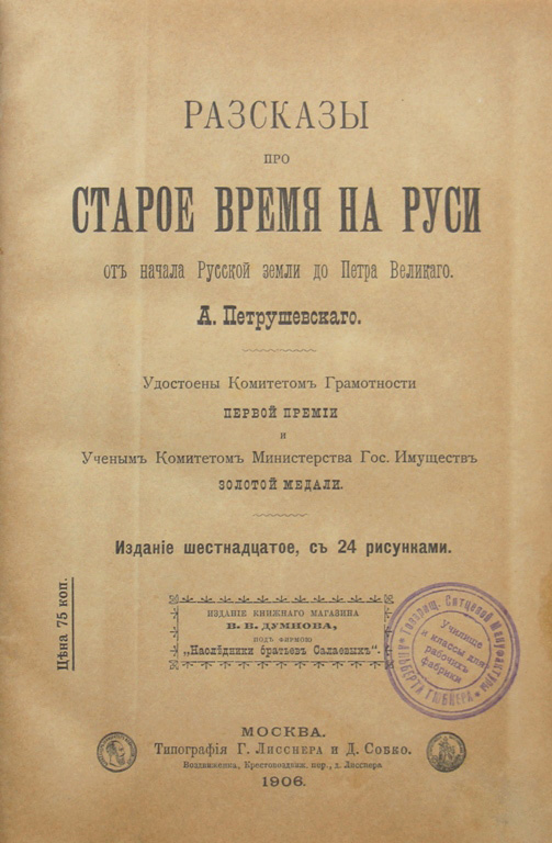 Петрушевский А. Разсказы про старое время на Руси от начала Русской земли до Петра Великаго. Издание шестнадцатое, с 24 рисунками. М., типография Г.Лисснера и Д.Собко, 1906. [4], 352 с., с илл. 20,5 х 13,8 см. В современном полукожаном переплете с золотым тиснением на корешке. Отличная сохранность. На титульном листе и с. 1 дореволюционные печати училища для рабочих фабрики Товарищества Ситцевой мануфактуры Альберта Гюбнера в Москве.
