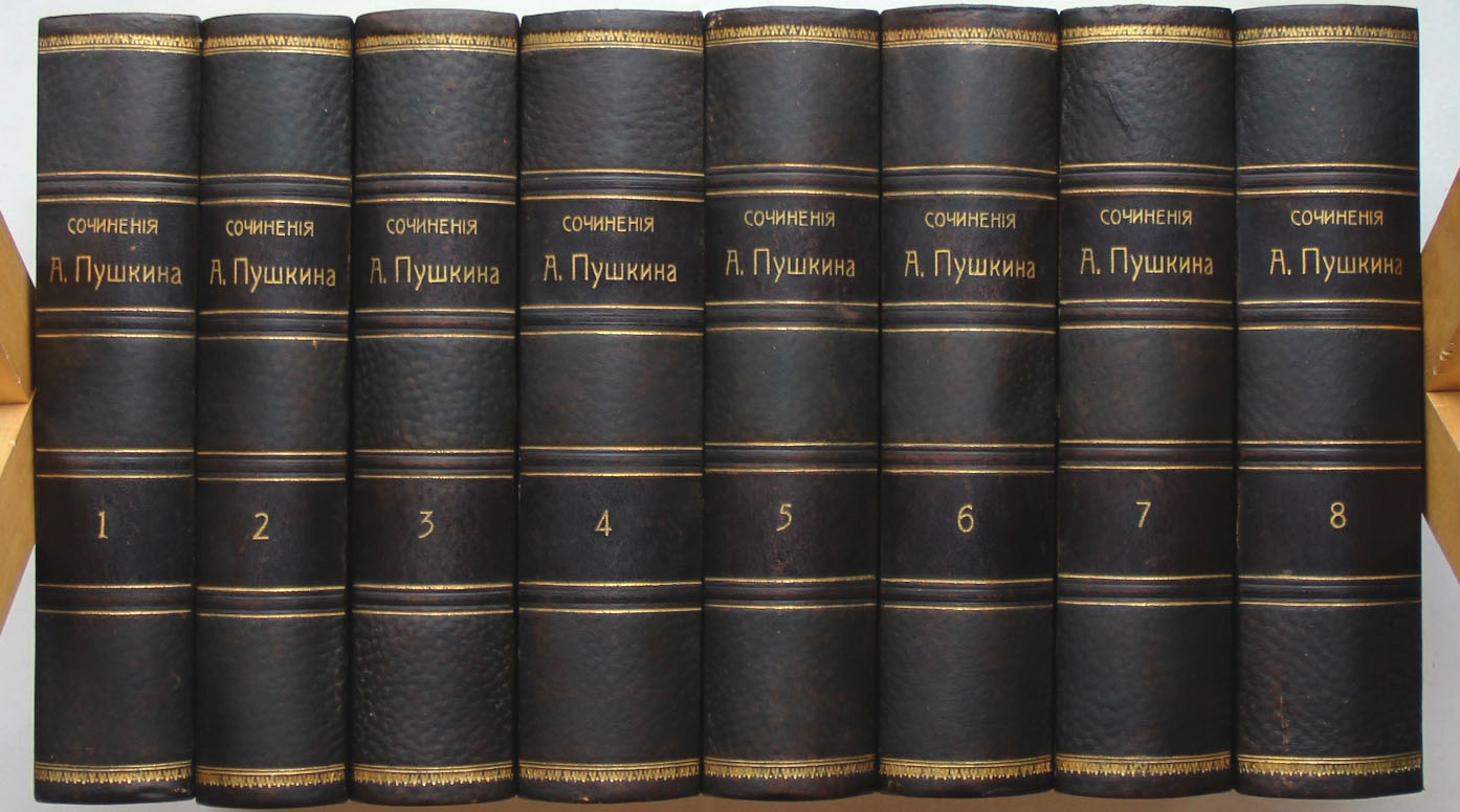 Пушкин А.С. Сочинения. Редакция П.А.Ефремова. 8 томов. [Спб.], издание А.С.Суворина, 1903-1905. 21,5 х 14,2 см. Экземпляр из меньшей части тиража на толстой бумаге. В восьми полукожаных переплетах эпохи. Отличная сохранность.