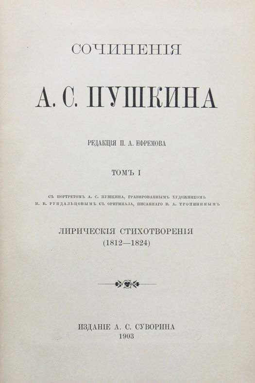 Том первый. С портретом А.С.Пушкина, гравированным художником М.В.Рундальцовым с оригинала, писаннаго В.А.Тропининым. Лирическия стихотворения (1812-1824). [6], VI, 572 с.; 1 л. портр.