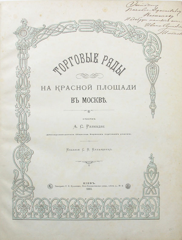 Размадзе А.С. Торговые ряды на Красной площади в Москве. Киев, типография С.В.Кульженко, 1893. 64, [16] с.; 35 л. илл. 37,5 x 29 см. В современном полукожаном переплете. Очень хорошая сохранность. На титульном листе дарственная надпись: «Господину Василию Афанасьевичу Климову на добрую память от Ивана Сергеевича Титова».