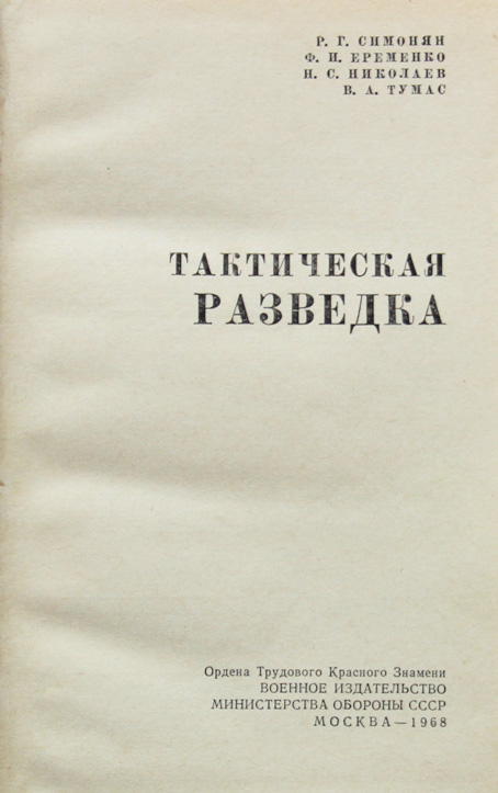 Симонян Р.Г., Еременко Ф.Н., Николаев Н.С., Тумас В.А. Тактическая разведка. М.: Военное издательство Министерства обороны СССР, 1968. 274, [2] с., с илл. 19,5 х 12,5 см. В современном полукожаном переплете. Отличная сохранность. На нескольких страницах аккуратные владельческие пометы.