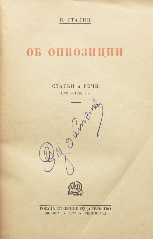 Сталин И. Об оппозиции: Статьи и речи. 1921-1927 г.г. М.-Л.: Государственное издательство, 1928. 750 с. 22,8 х 15 см. В современном полукожаном переплете. Сохранена издательская обложка. Очень хорошая сохранность. На титульном листе владельческая подпись.